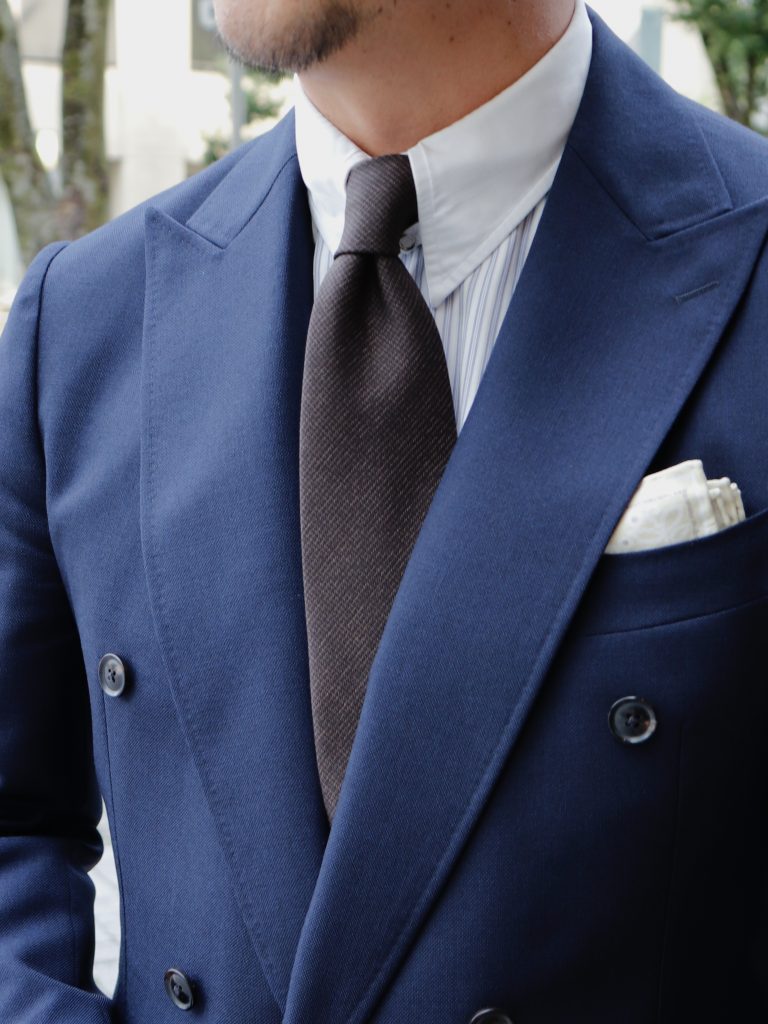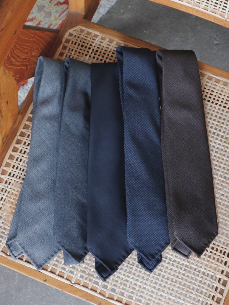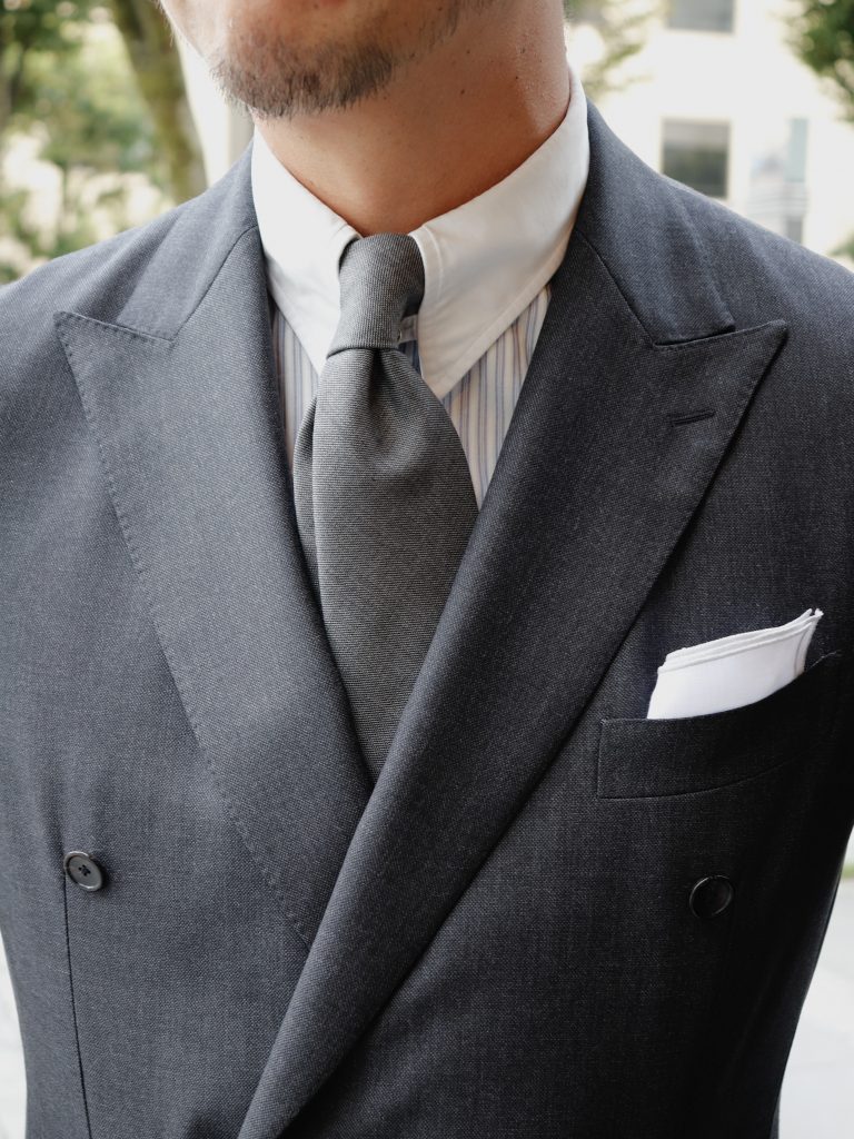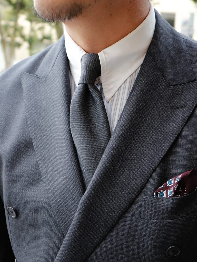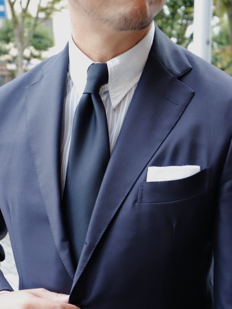 また、この三つ折りのネクタイは通常のネクタイと違って、ネクタイの原型であるスカーフを思い起こすような優雅さだったり上品さだったりを感じます。これがネクタイ好きにはたまらないんですよね!!