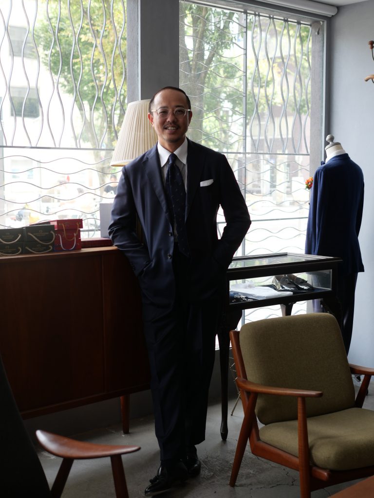 日頃から夏の暑さにやられてスポーティーなスタイルが多く、そろそろスーツ屋ということが疑われそうなので、久々にかっちりネイビースーツ。