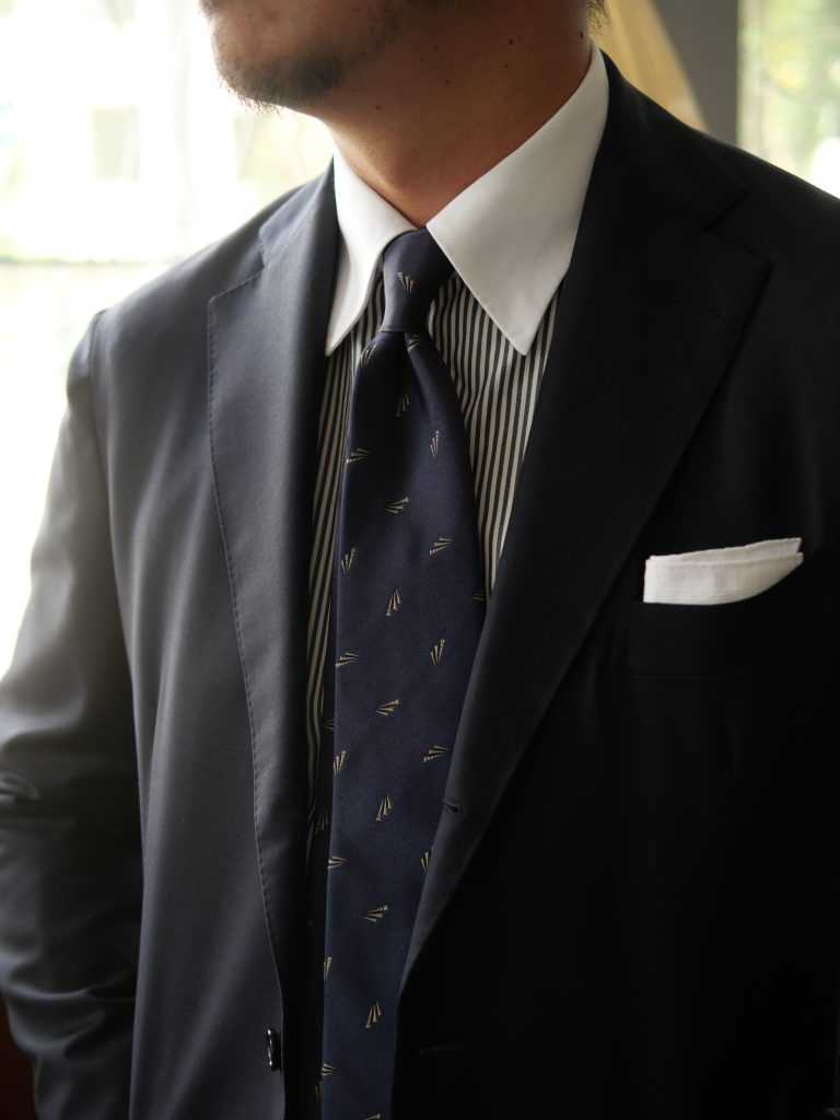 そしてネクタイは今季のロバートフレイザー(10,000yen+Tax)。大柄のネクタイで他人と差別がするのもスーツスタイルの面白さではありますが、今回は小さな柄で上品さをアピール!!あまり主張を強くしたくないシーンには持ってこいの1本ですね!