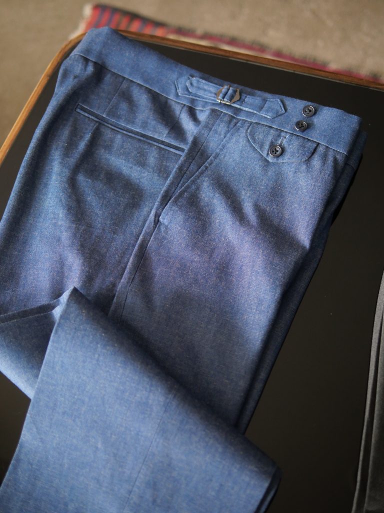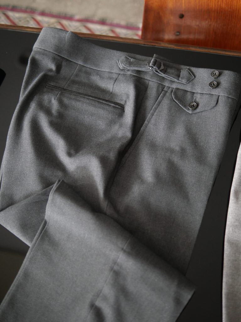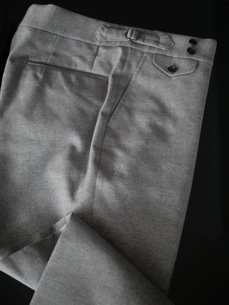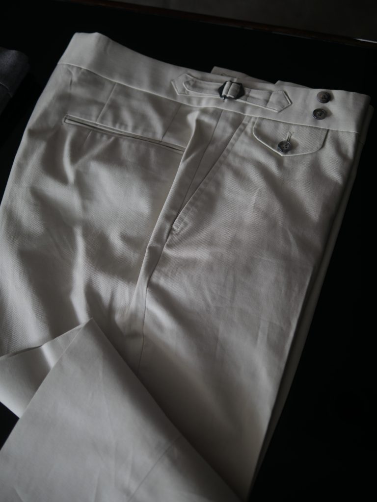 いずれのパンツもベルトレス仕様でクラシカルな面持ち。帯の幅も太めにしているあたりも、お客様の拘りを感じます。