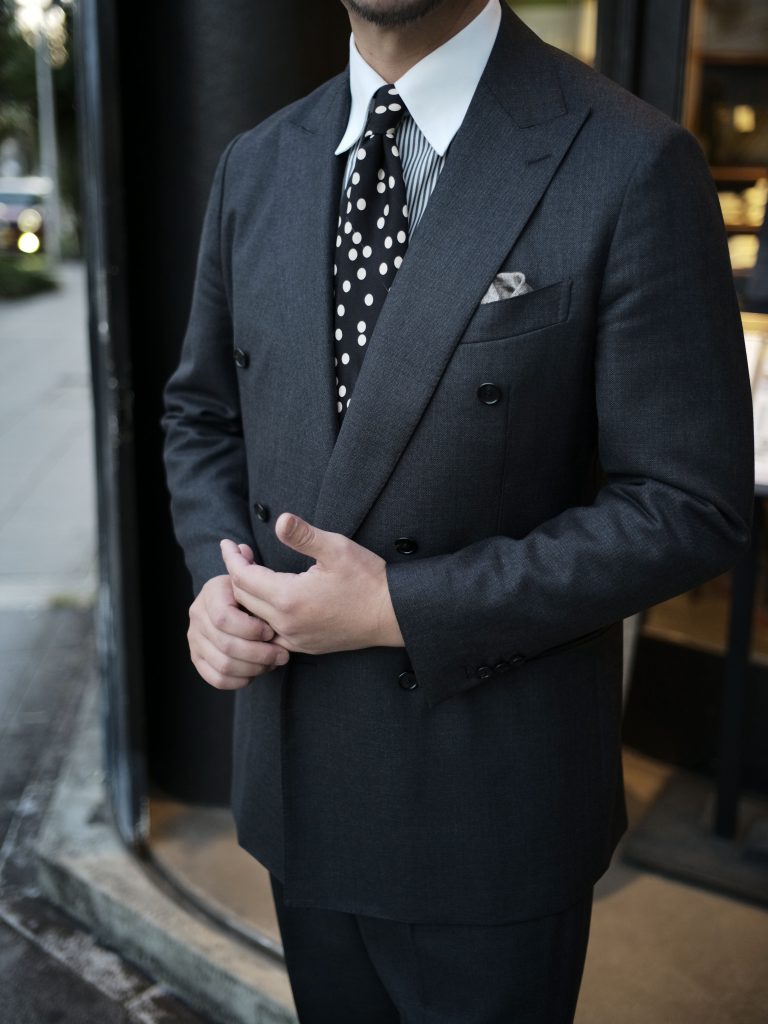 重厚感があり、ハリコシの強いHarrisons/ハリソンズの”オイスター”を用いて、イタリア的に軽やかな仕立てで作ったダブルブレステッドスーツ。スーツのカラーに合わせたグレーストライプのクレリックシャツに、モノトーンを意識したブラックベースの変則ドット柄タイ。