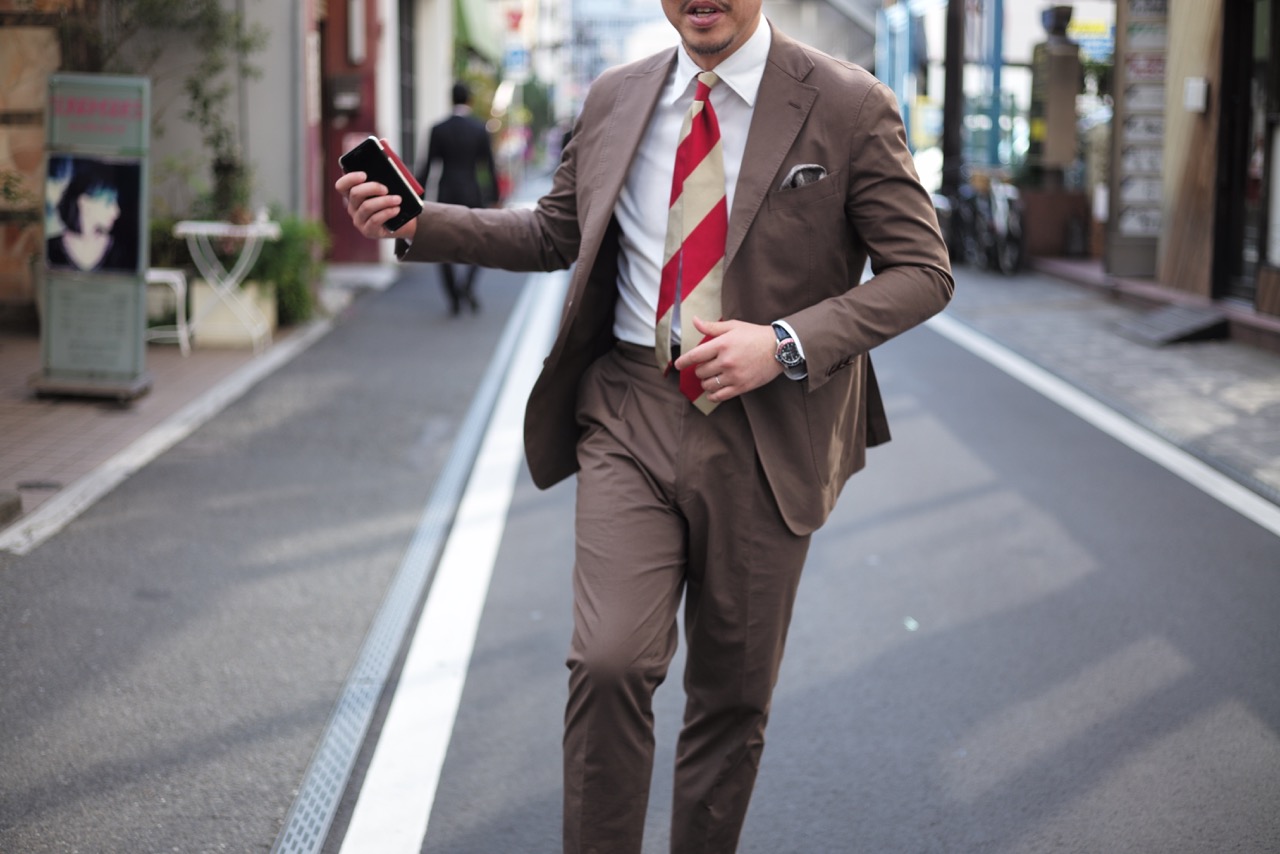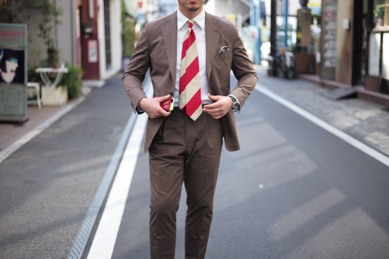 現在進行形でもある、レジメンタルストライプのトレンドに引っ張られ、このタイを久しぶりに締めてみたんですが、今の気分にピッタリ。ちょいレトロな空気を感じる仕上がりに。