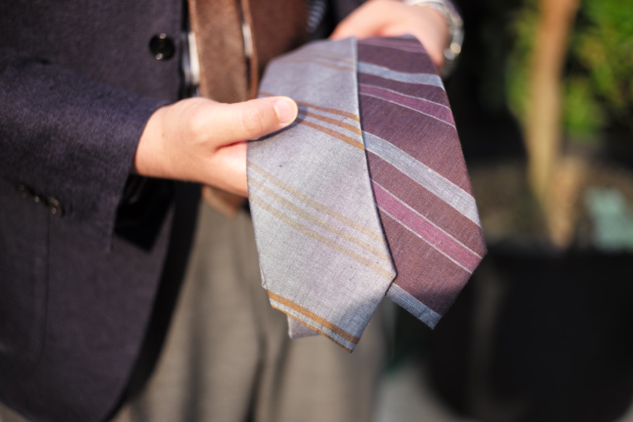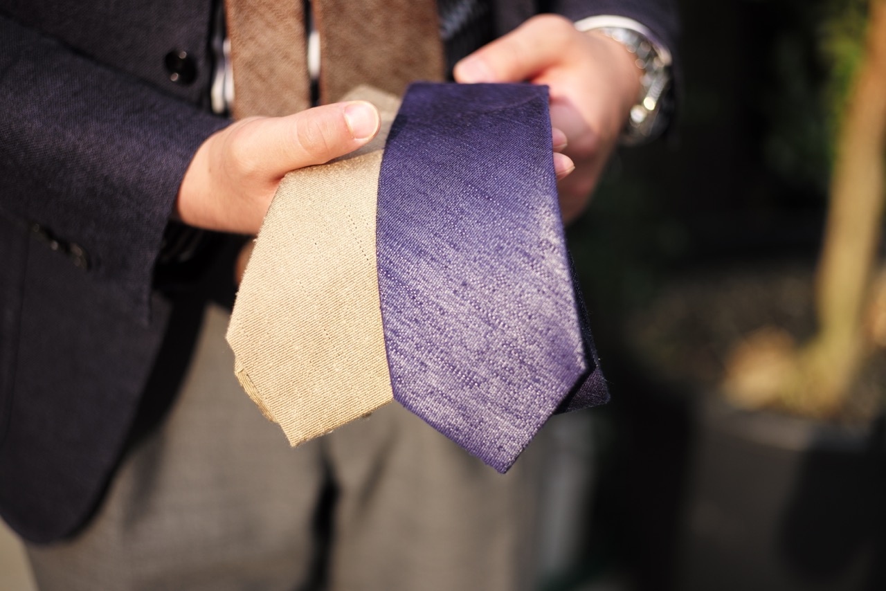 リネン+コットンの非常に春夏らしいサラっとした生地感。涼し気な雰囲気を表現したければ、このTieがオススメです。暑苦しく見られてしまう方にも最適ですね。