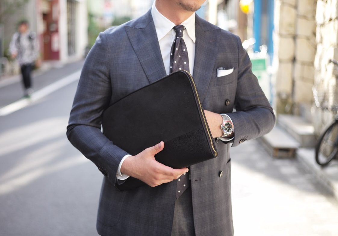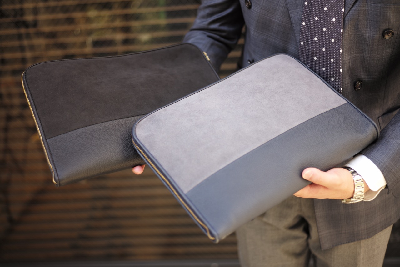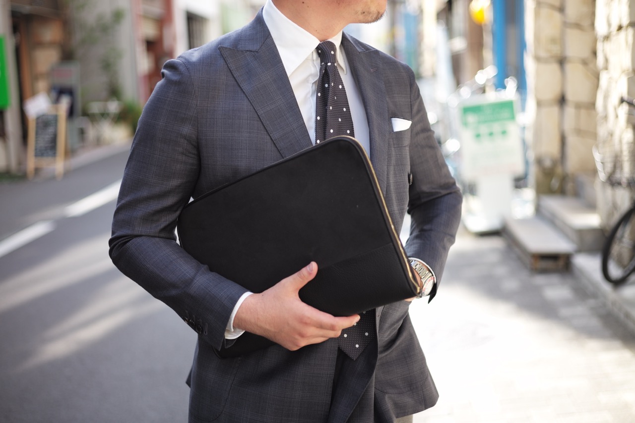 柔らかくしっとりとした革が、吸い付くように手に馴染み、持つ者の気分をグッと高めてくれるようなバッグです。さらにクラッチの良いところと言えば、小脇に抱えて歩く軽快感。ぜひBRUNOのオーダースーツと合わせて颯爽と歩いていただきたい次第。