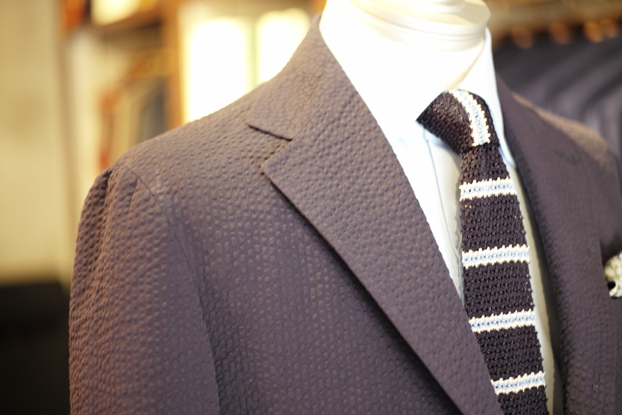 畝が通常より大きい分、どのような仕上がりになるか実は不安もありましたが、シアサッカーらしさが際立ち、素晴らしい仕上がりとなりました。ビジネスカジュアルに、プライベートでのデートシーンにと、着回すことができそうですね。イタリア生地ブランド”ソルビアティ”要注目です。
