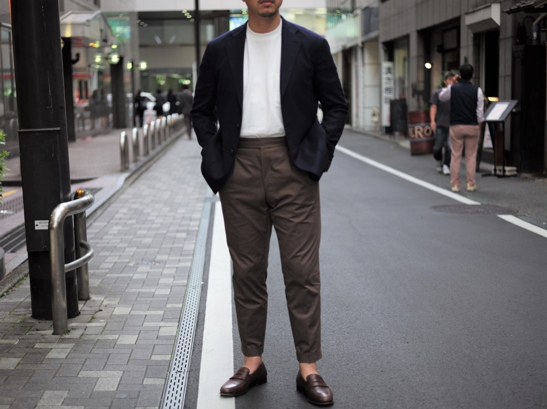 本日は私のリラックススタイルを少しだけ。セットアップで創ってあったコットンスーツのパンツに少しユルめのTシャツ。ややハイウエスト気味+パンツインで、お洒落感度の高い人にはわかるこの”イマドキ感”。こんなときでもベルトレスが気分ですね。