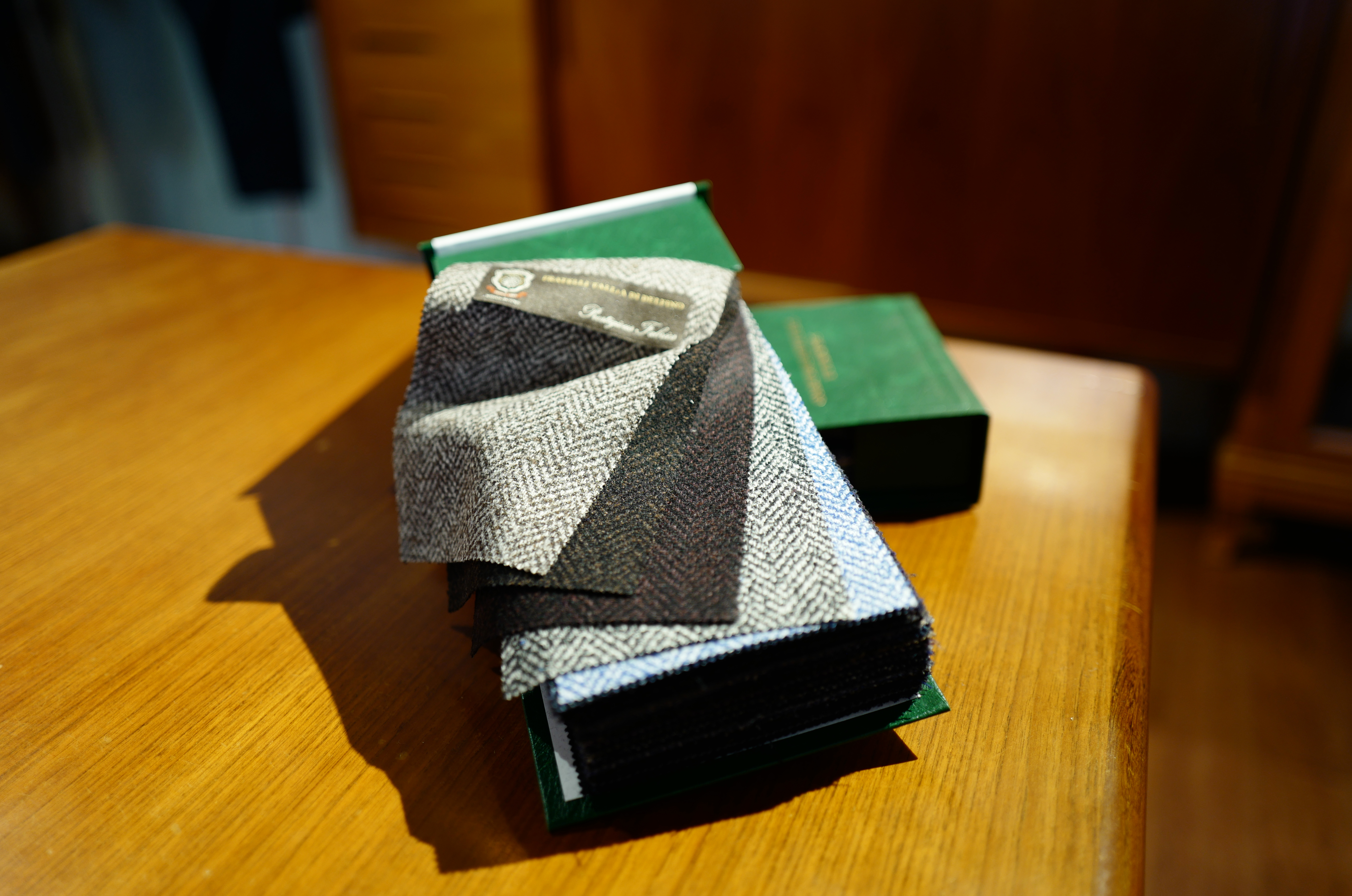 今回は上質なジャケット生地が集められた1冊です。写真のようなシンプルな色柄から、大柄のチェックがメインとなっております。他の生地ブックと比べると薄手ものが多く、カジュアルになりすぎず、キレイめにまとまったジャケットスタイルを創り上げる際には、とても良さそうです。
