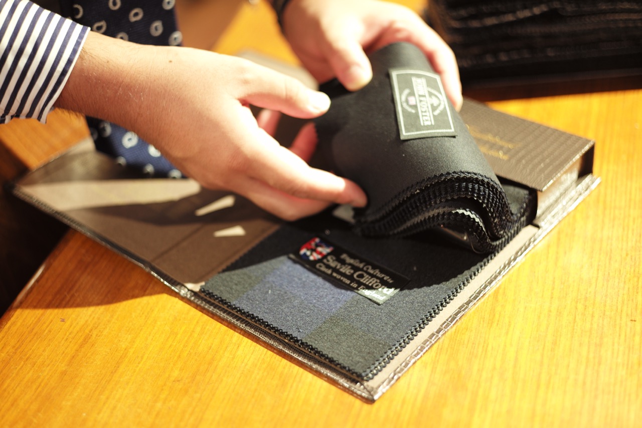 右側のバンチブックは英国生地の3ブランド。英国らしい適度なハリを感じる生地感。このようなハリのある生地と繊細な生地とでスーツを作り比べると、やはり今回のようなハリのある生地はパリッとした印象に仕上がります。生地自体と強さもあり、ちょっとしたことでは生地も傷みづらいです。ビジネスシーンにて毎日のようにガンガンと着用するスーツを作りたい場合は、このような生地がオススメです。