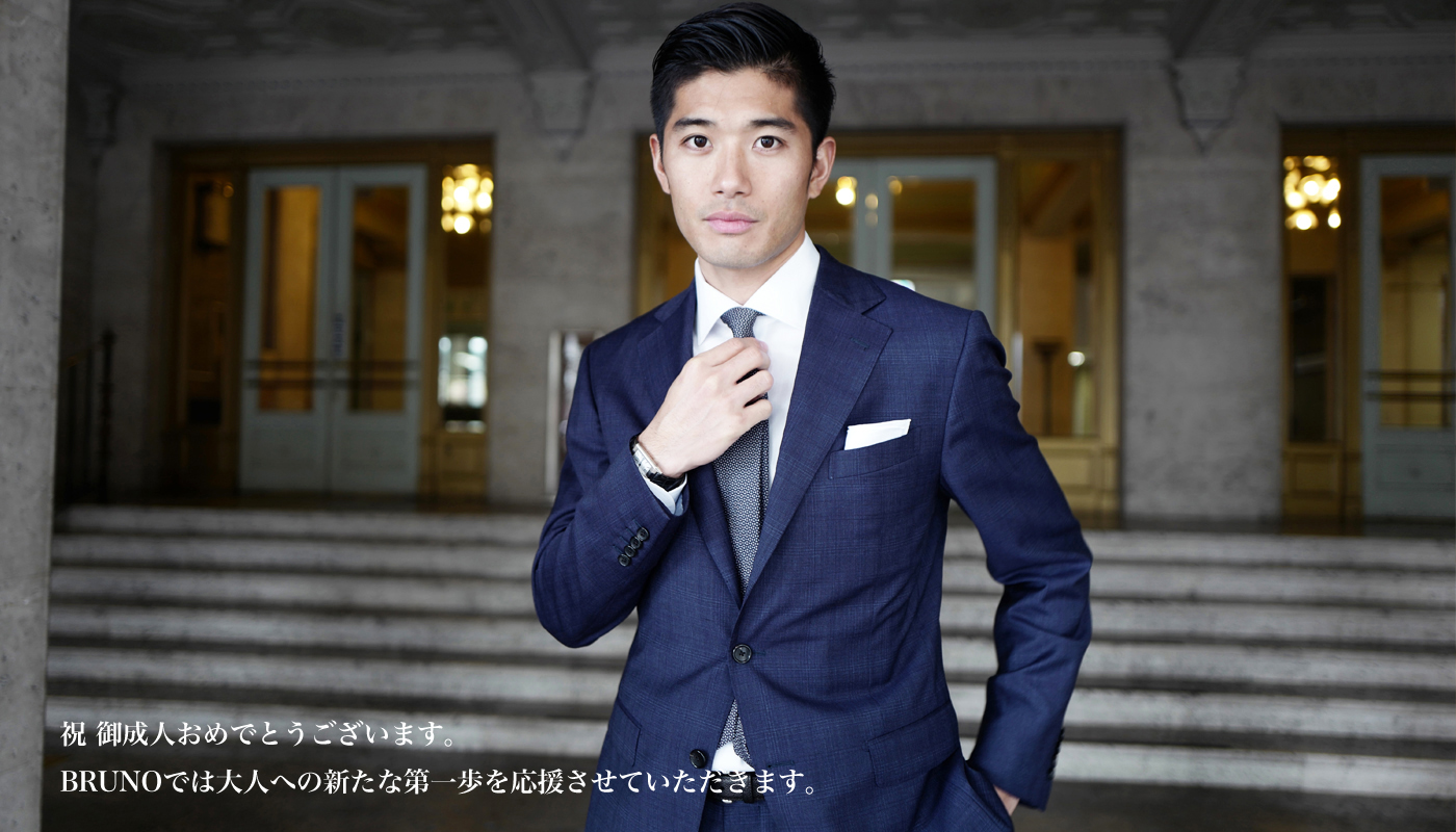 大切な大切な大人の第一歩は、ぜひBRUNOのオーダースーツをご着用ください。今後着用する機会が非常に増えるであろうスーツの価値感を、BRUNO品質でご体感いただたい。大人として、男としての身だしなみを、身体に合ったスーツ、また着こなしのテクニックとしてお伝えできればと幸いです。