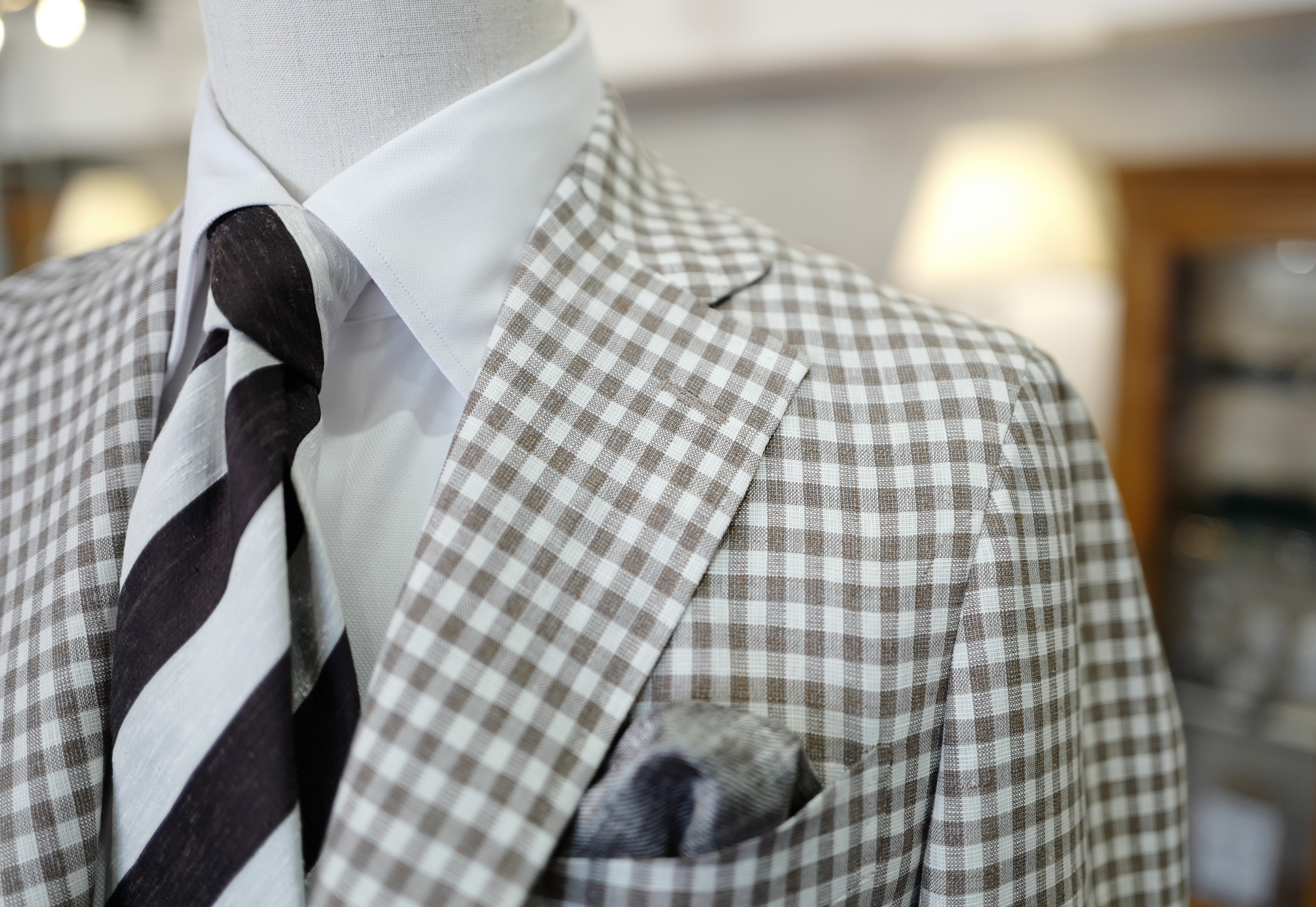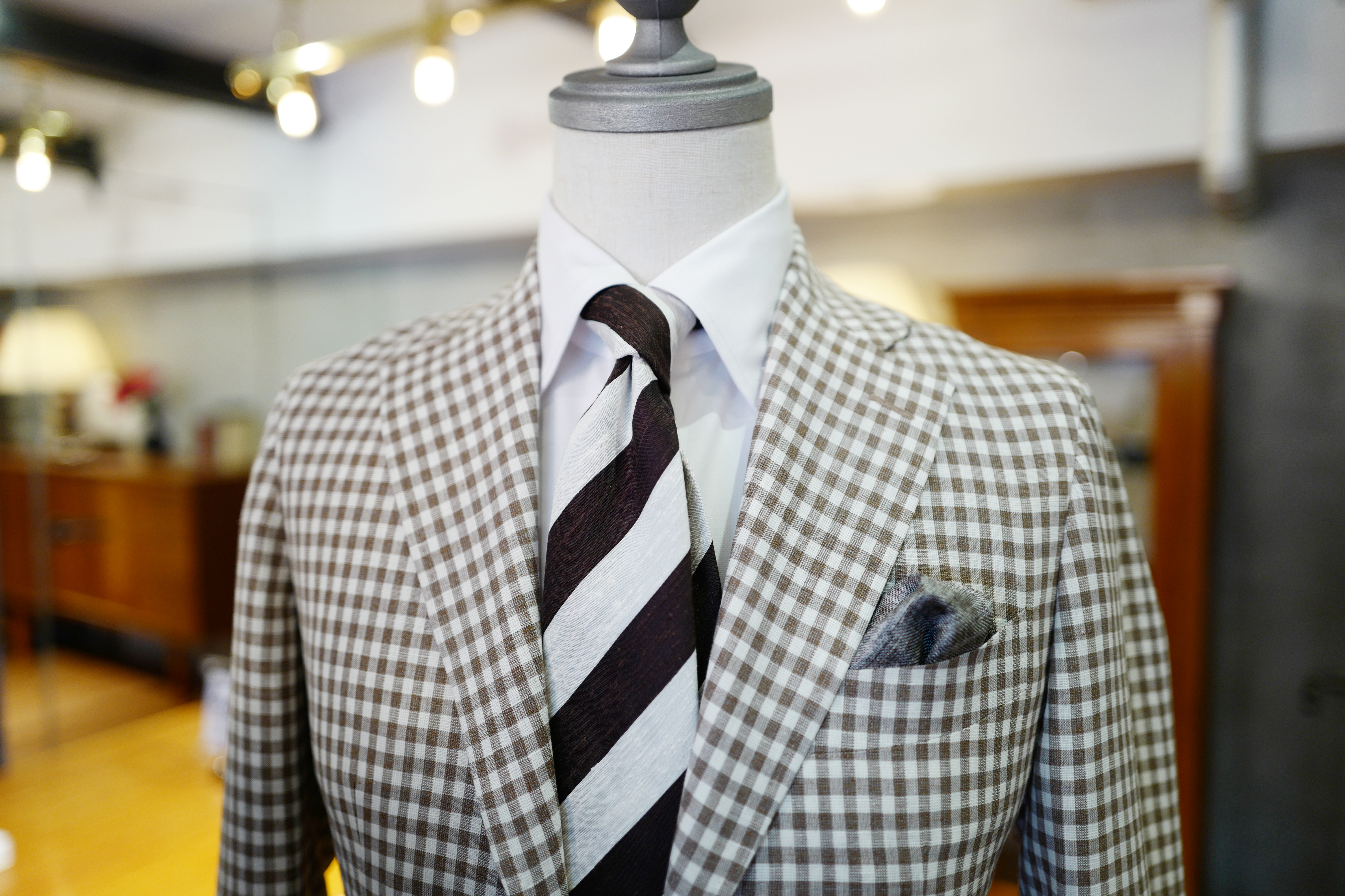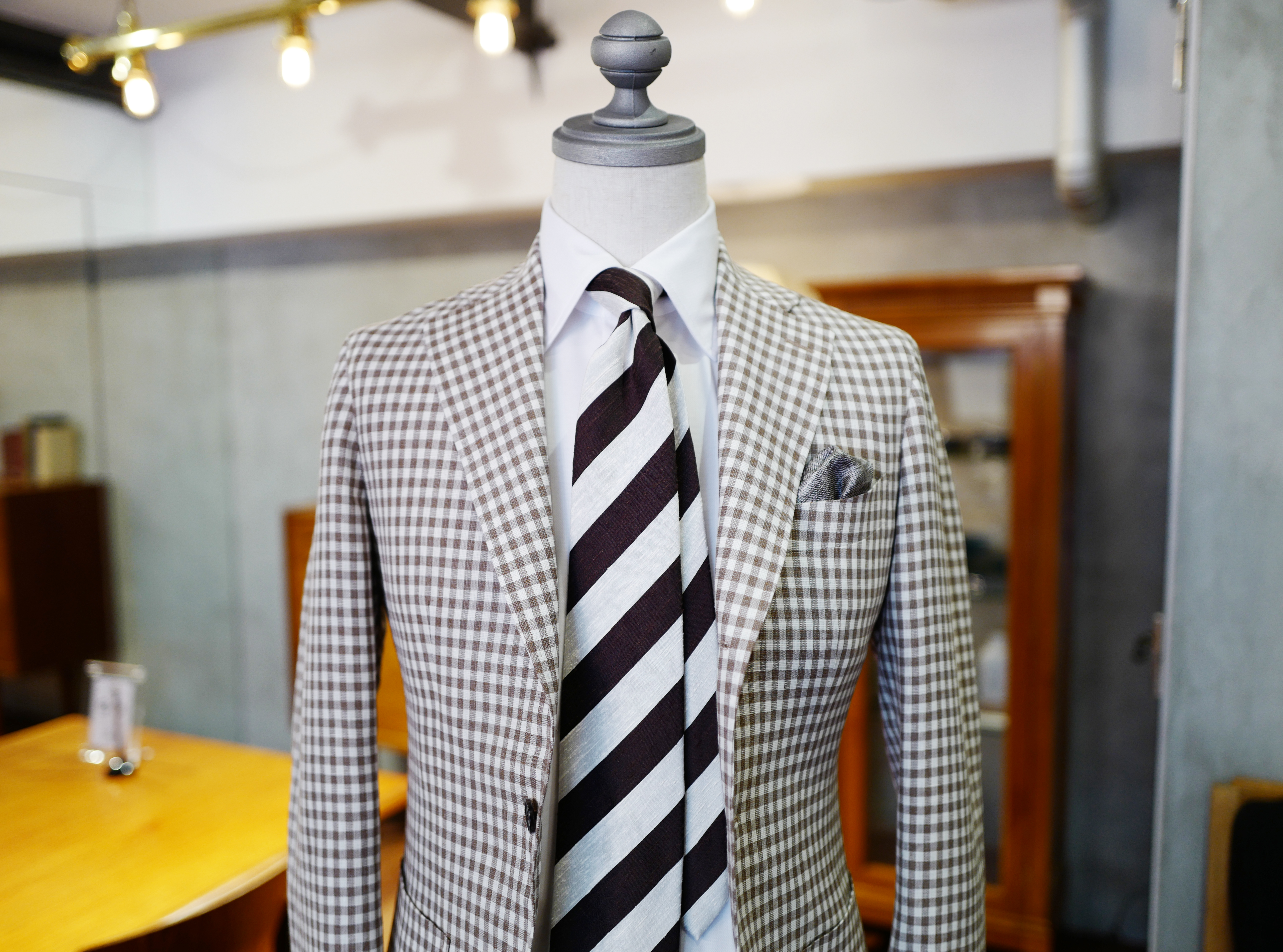 K様のご要望は”職業に合ったジャケットがほしい”とのことでしたので、らしさ溢れるウールリネンの、軽快な生地をオススメさせていただきました。