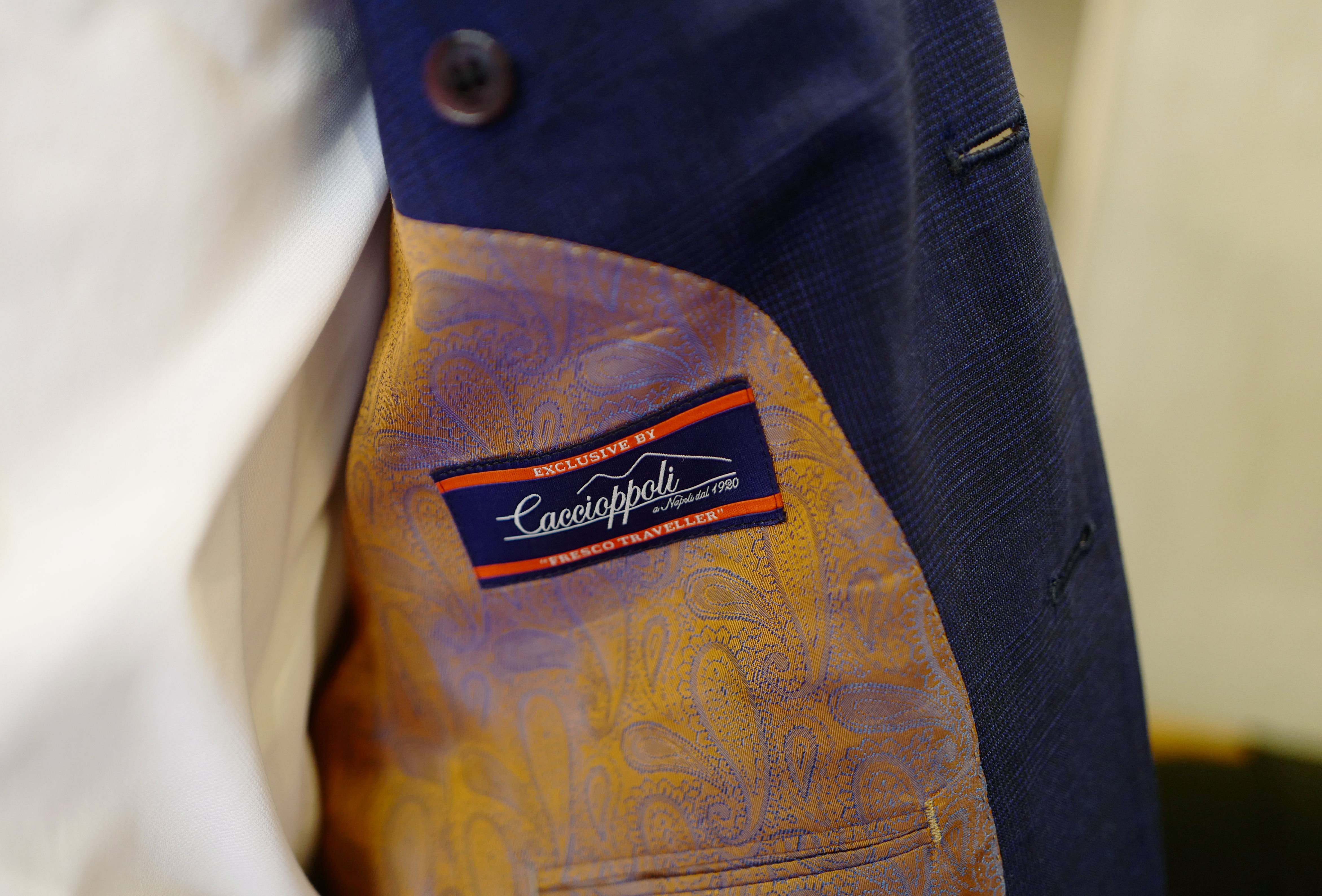 ライクラ【lycra】、いわゆるポリウレタンを用いた生地で伸縮性を高め、非常に着心地の良い1着が仕上がりました。見た目のカッコ良さ(シルエット)と、動きやすさを両立させるには打って付けの生地。BRUNOにおいては高価な生地にあたりますが、ご興味のある方はぜひお試しいただきたいと思います。カチョッポリのブランドイメージに合うような、色鮮やかな裏地選びもさすがS様のセンスです。