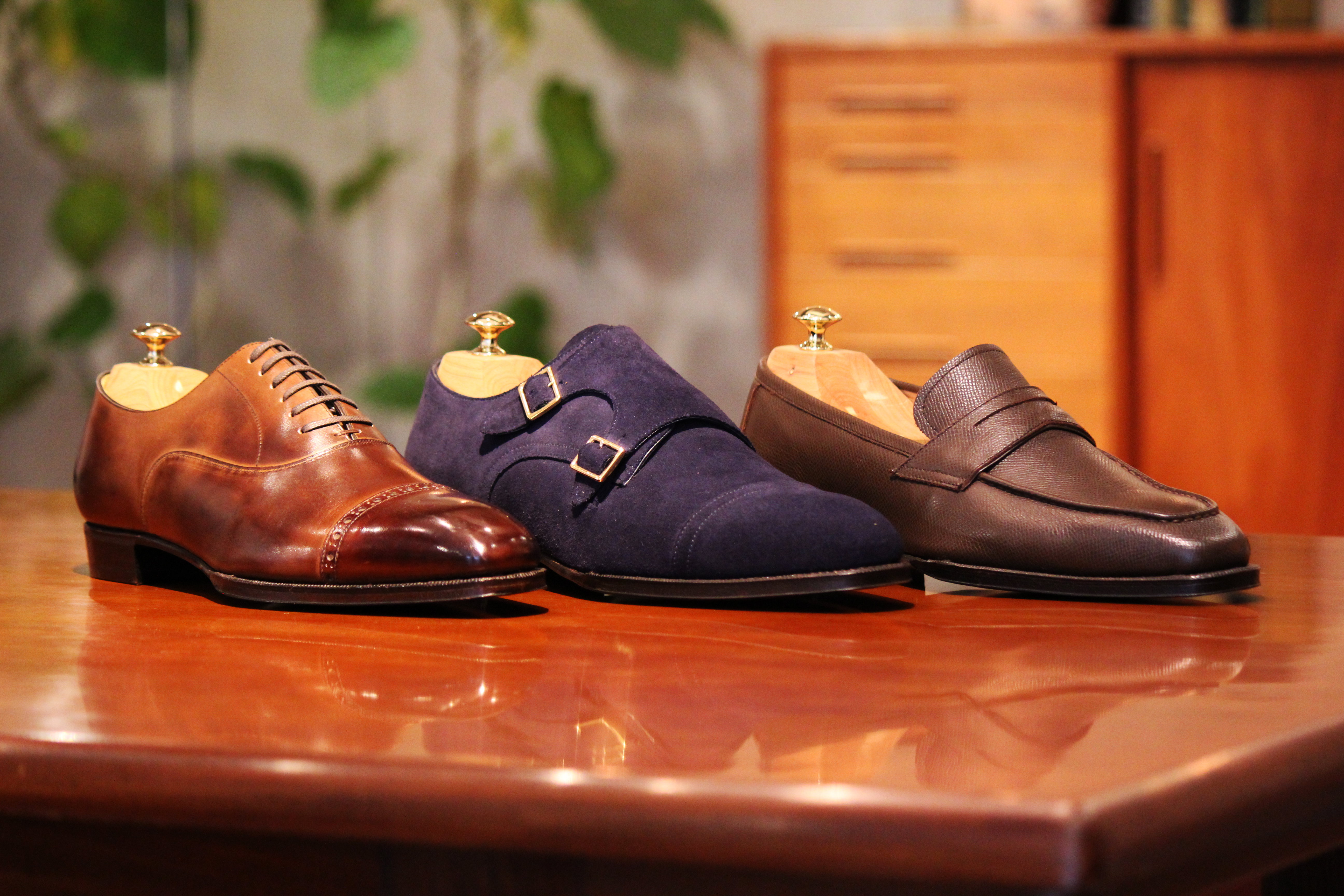 モデルは3型。内羽根式ストレートチップ、ダブルモンク、コインローファー。いずれも写真から見て取れる高級感。この3型から1型をお選びいただき、サイズサンプルを履いていいただき、サイズを決定します。選択できる革は、【CHARLES F. STEAD】(チャールズ エフ ステッド)のスウェード。【ANNONAY】(アノネイ)のカーフ。【Weinheimer】(ワインハイマー)のシボ革(+3,000yen+Tax)。世界有数の高級革を自由にお選びいただき、この他にもインソールカラーや、コバのカラー、シューレースも選択可能です。