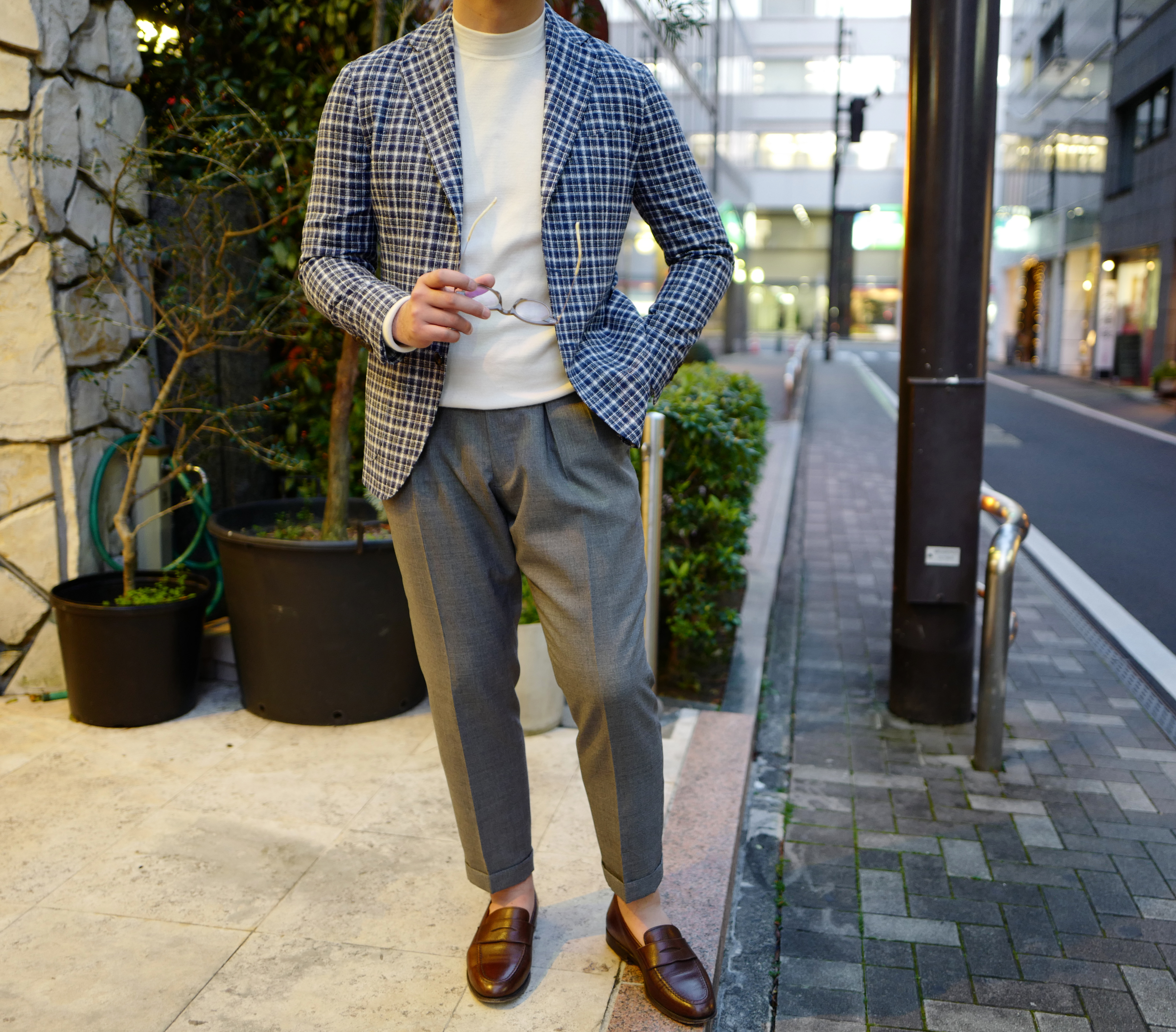 ほぼ裏地を省いた仕立てにより軽やかな仕上がり。カジュアルビジネススタイルとして、タイドアップも良いですが、オススメはカジュアル使い。ということで、先輩に許可をいただき着用。
