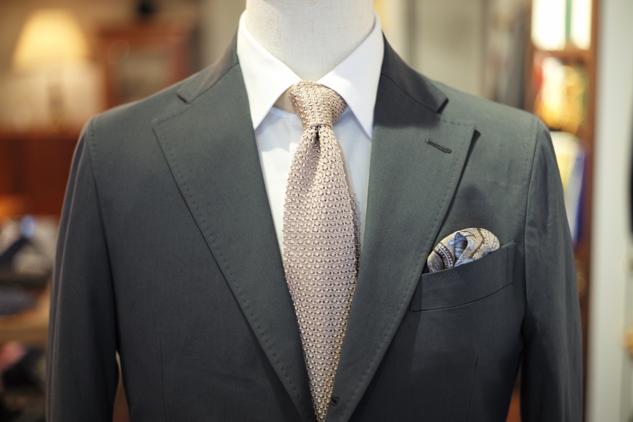 今回のS様の1着は、深いグリーンをした独特な色味。スーツやジャケットの渋みが強い時には、明るいカラーのタイとチーフを心掛けると良いですね。バランスが取れ、春夏らしい軽快感も生まれます。Vゾーンの合わせにお悩みの方は、ぜひぜひご相談ください。