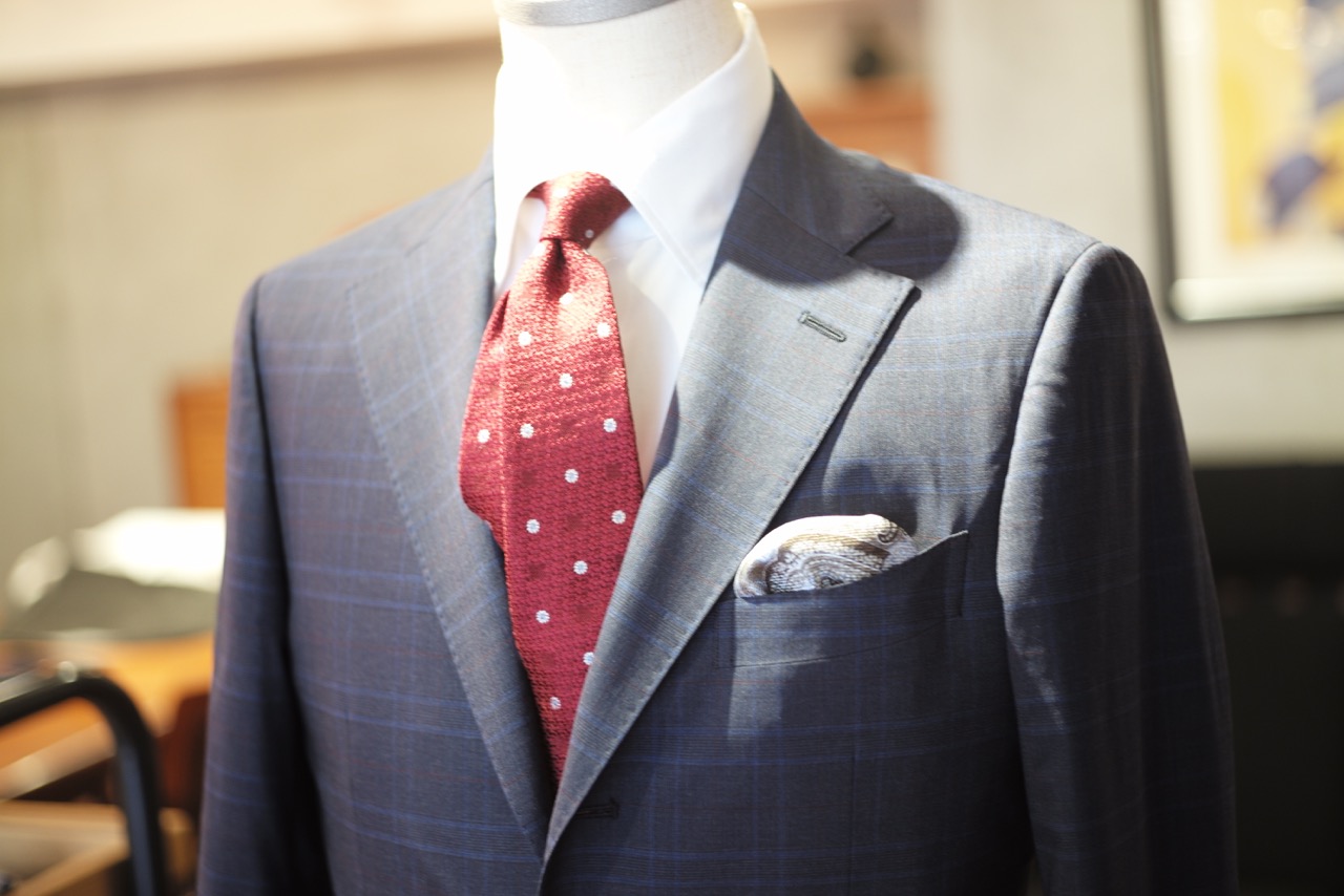 濃紺をベースとしたカラーに、青系のチェックと、薄っすらと入った赤のライン。お創りいただいたK様のお仕事を考慮しますと、薄っすらした赤のラインにリンクさせて、赤のタイで情熱なVゾーンを構築するのが良いと思いました。正義感と力強さが加わり、より仕事をアクティブにこなせそうですね。