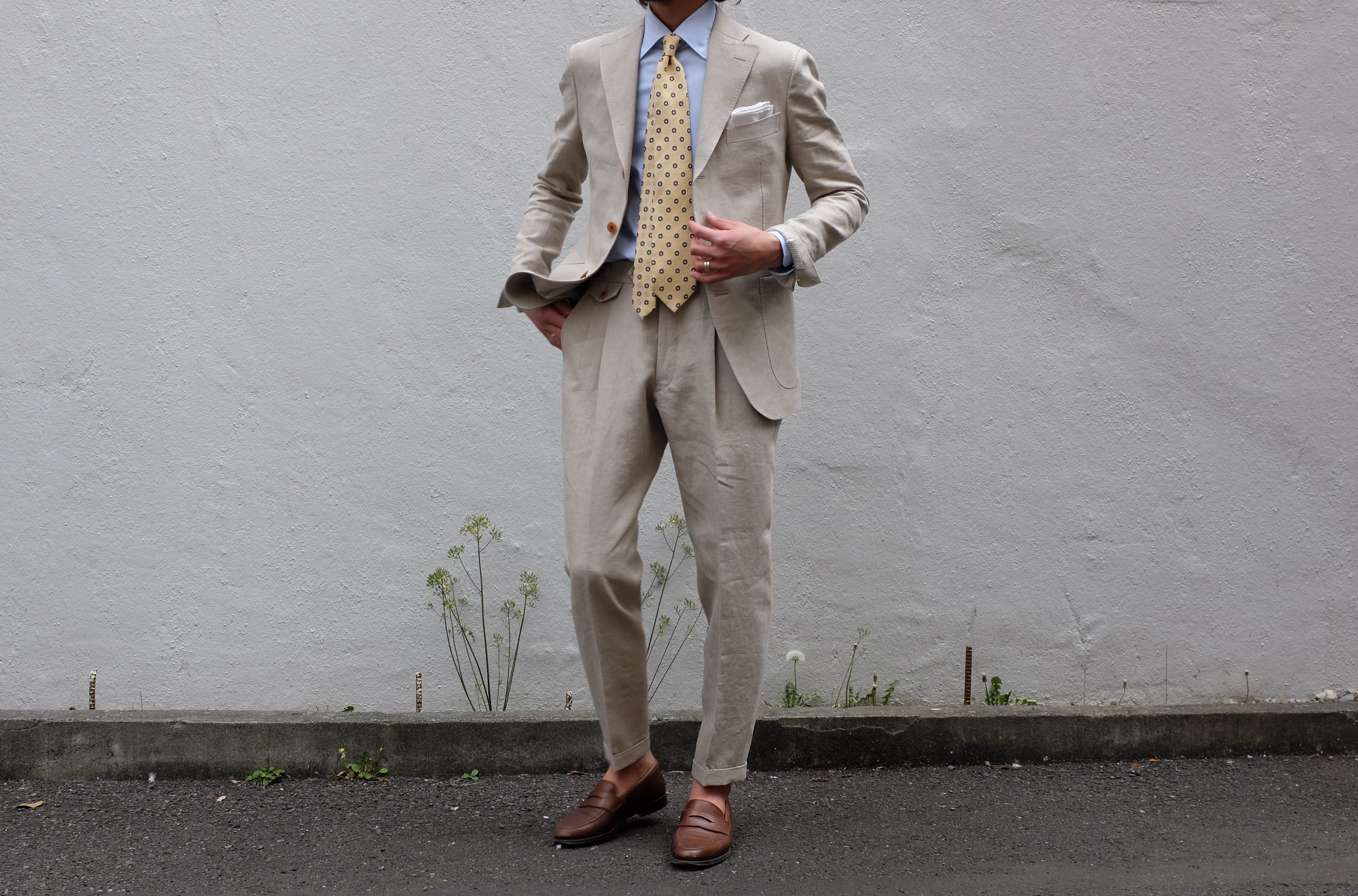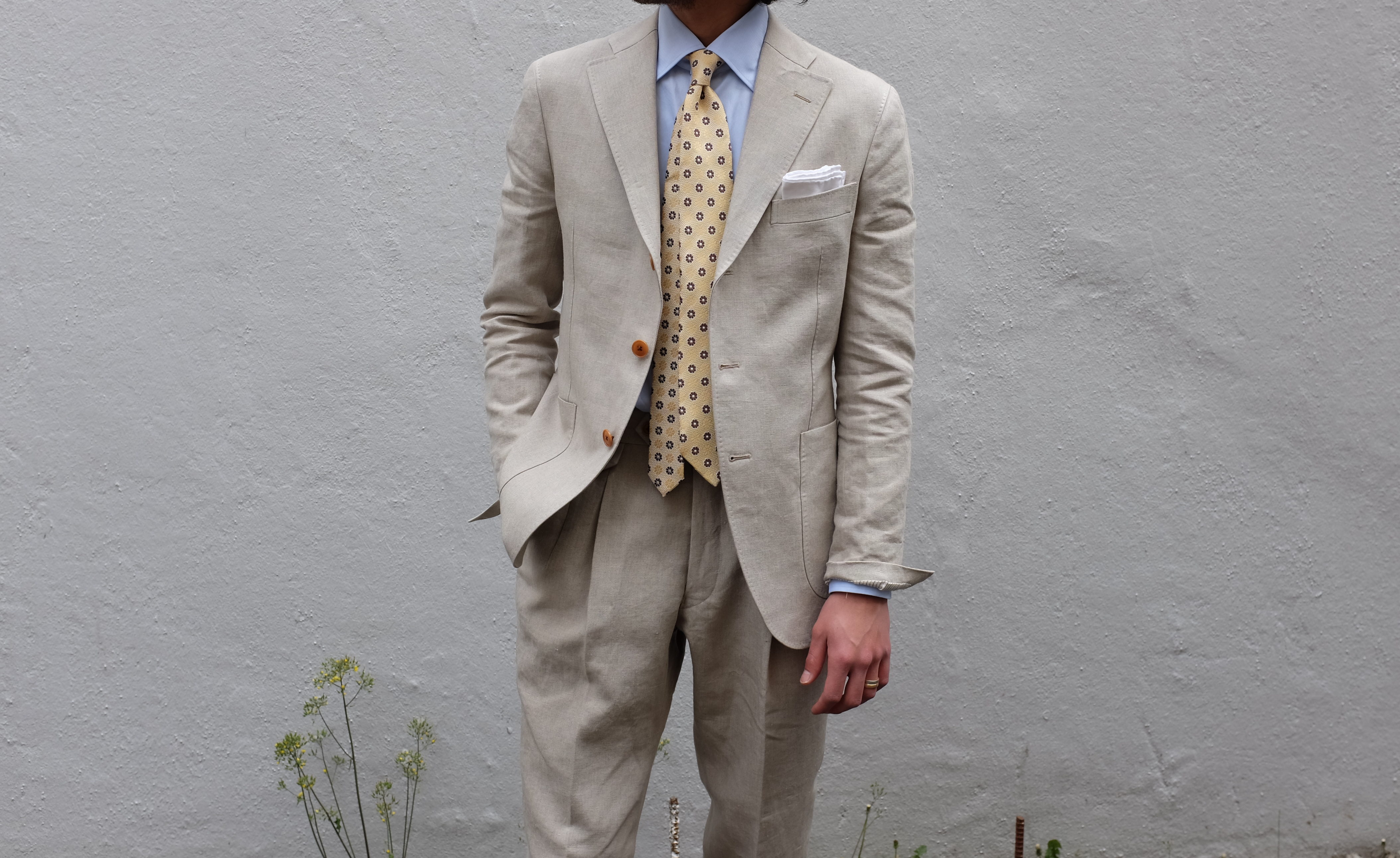非常に軽快に見えるのは、エクリュという視覚効果だけではなく、その素材。コチラのスーツは夏生地の代名詞”リネン100%”にて仕立てられております。通りで涼し気に見えるってワケです。