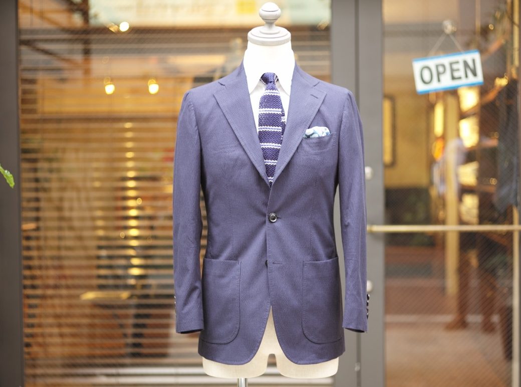 当店でも非常に人気の高い、イタリアはナポリのカチョッポリ社製シアサッカー。当然軽く涼しく着れる生地で、さらには”半裏”というライニングをほとんど使用しない軽快な仕立て。