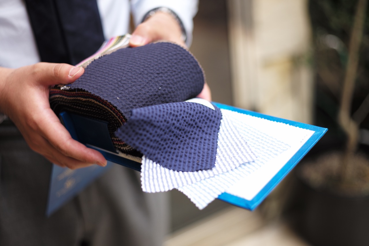 本日は、静岡県内屈指の人気を誇る美容室オーナーO様のオーダースーツをご紹介。社員全員を連れてハワイ旅行へ行ってしまうのですから、さすがの一言です。さて、そんなO様のスーツはシアサッカー生地の春夏仕様。