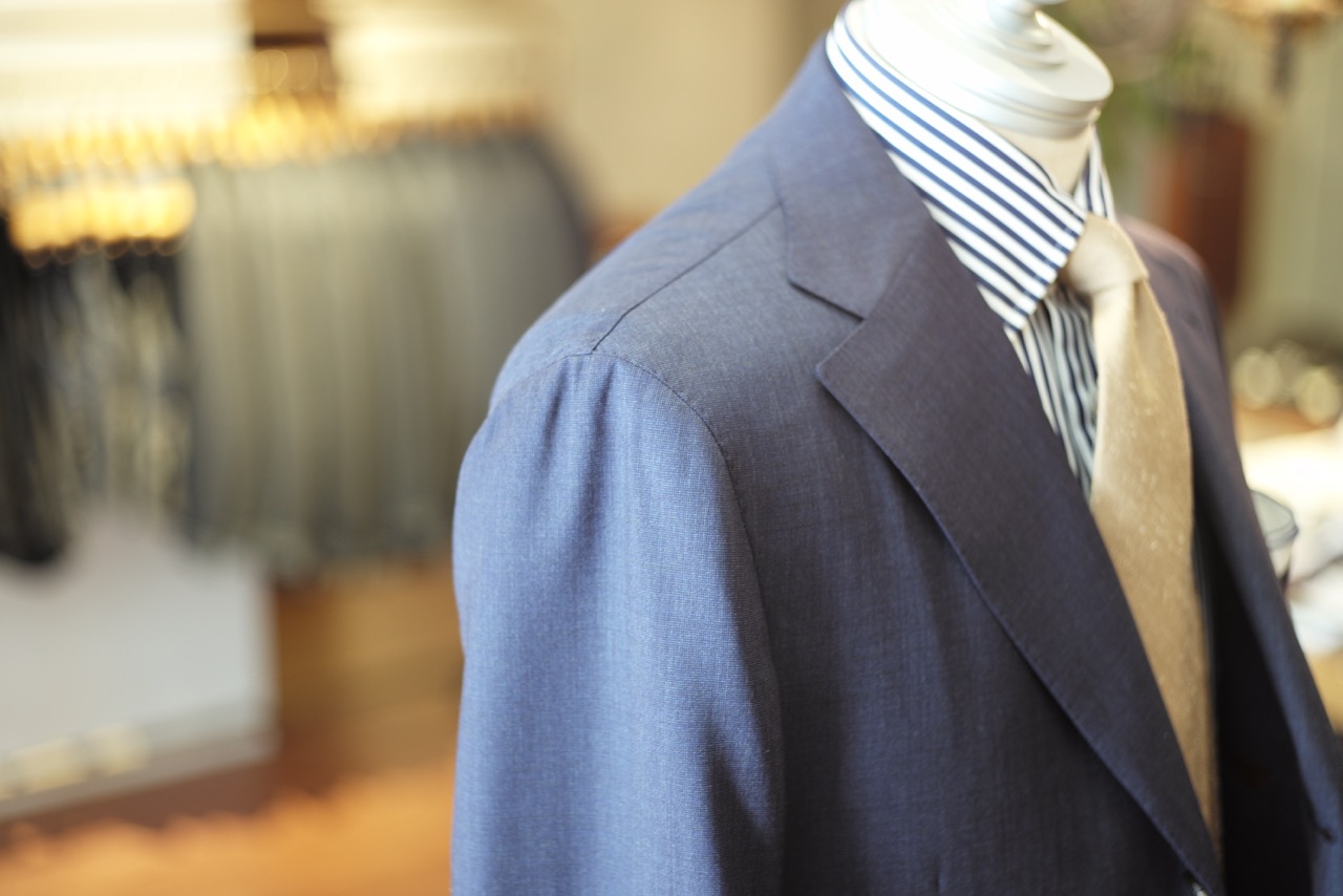 軽快感を意識した、肩パットなし、マニカカミーチャ(シャツ袖仕様)。特に夏場は”軽い着心地”と”軽快なルックス”が重要ですからね。さて、皆様に”夏スーツ”の準備を急ぎましょう。