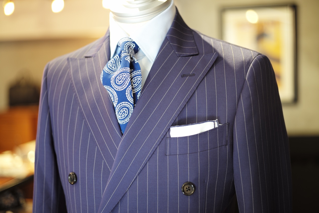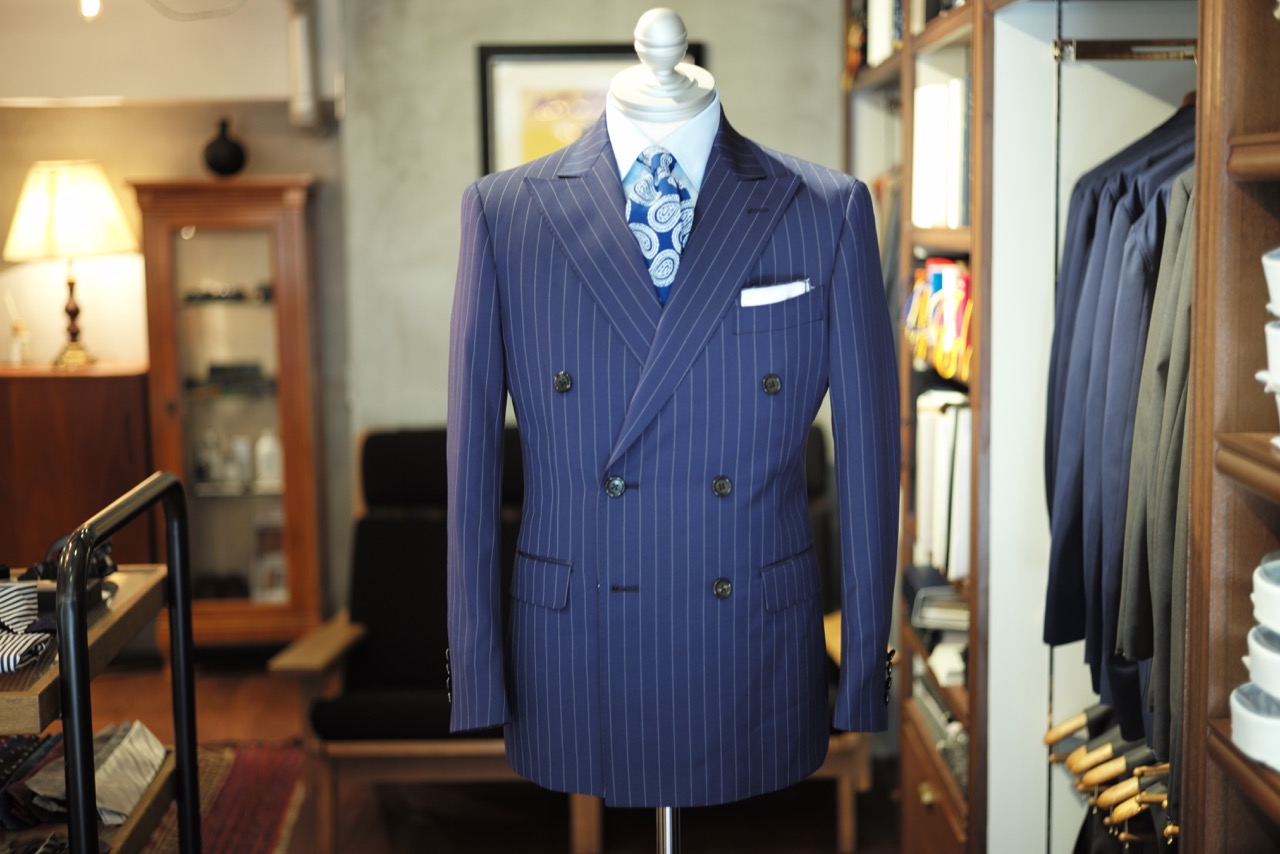 オールシーズンでご着用いただける鮮やかなネイビーストライプの生地。今回はビジネスシーンではなく、パーティーなどへ出席される際のスーツを仕立てたいとのことで、この華やかなスーツが仕上がりました。今回のようなダブルブレステッドスーツは、貫禄のある印象も与えられますので、シーンによって使い分けるといいと思います。