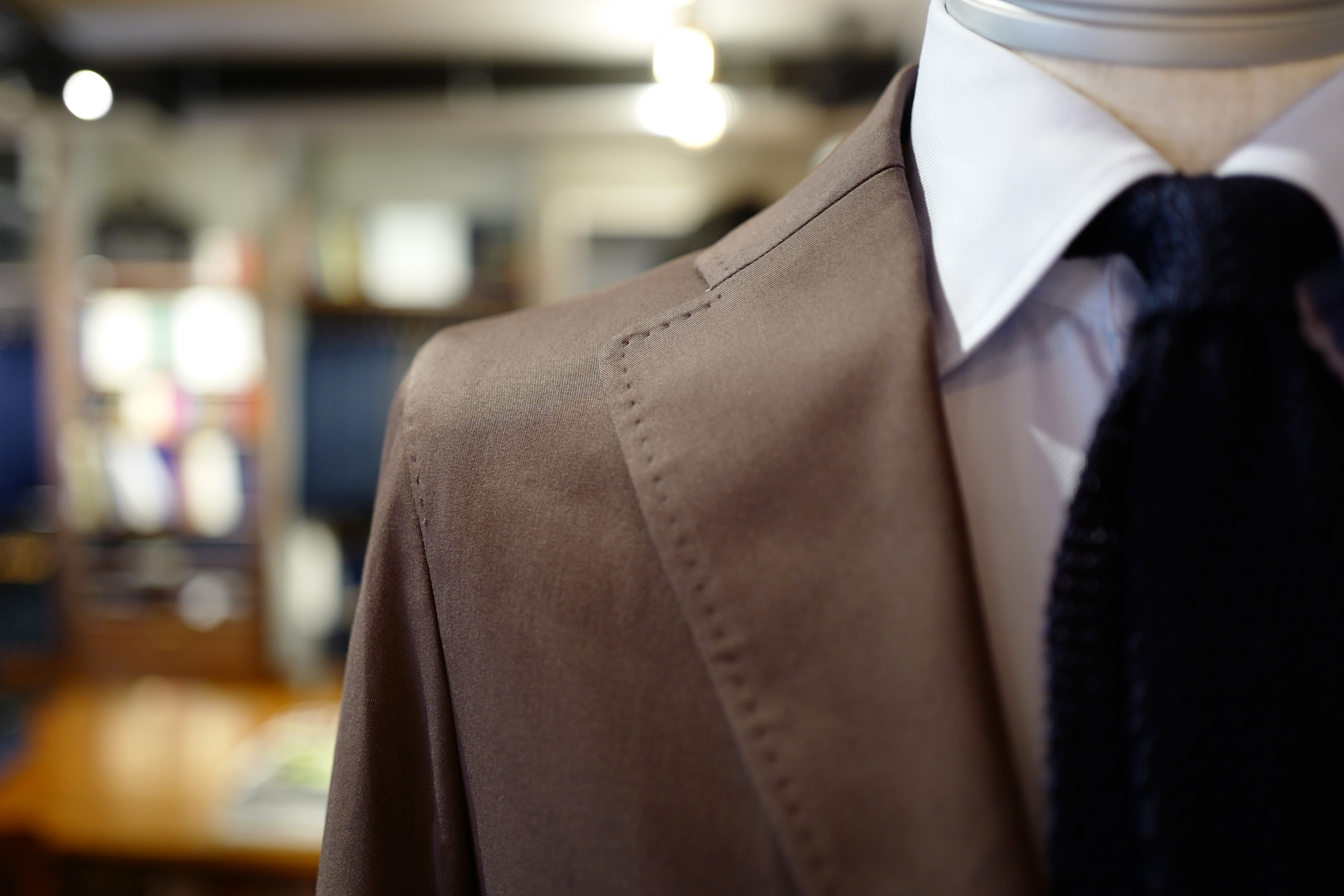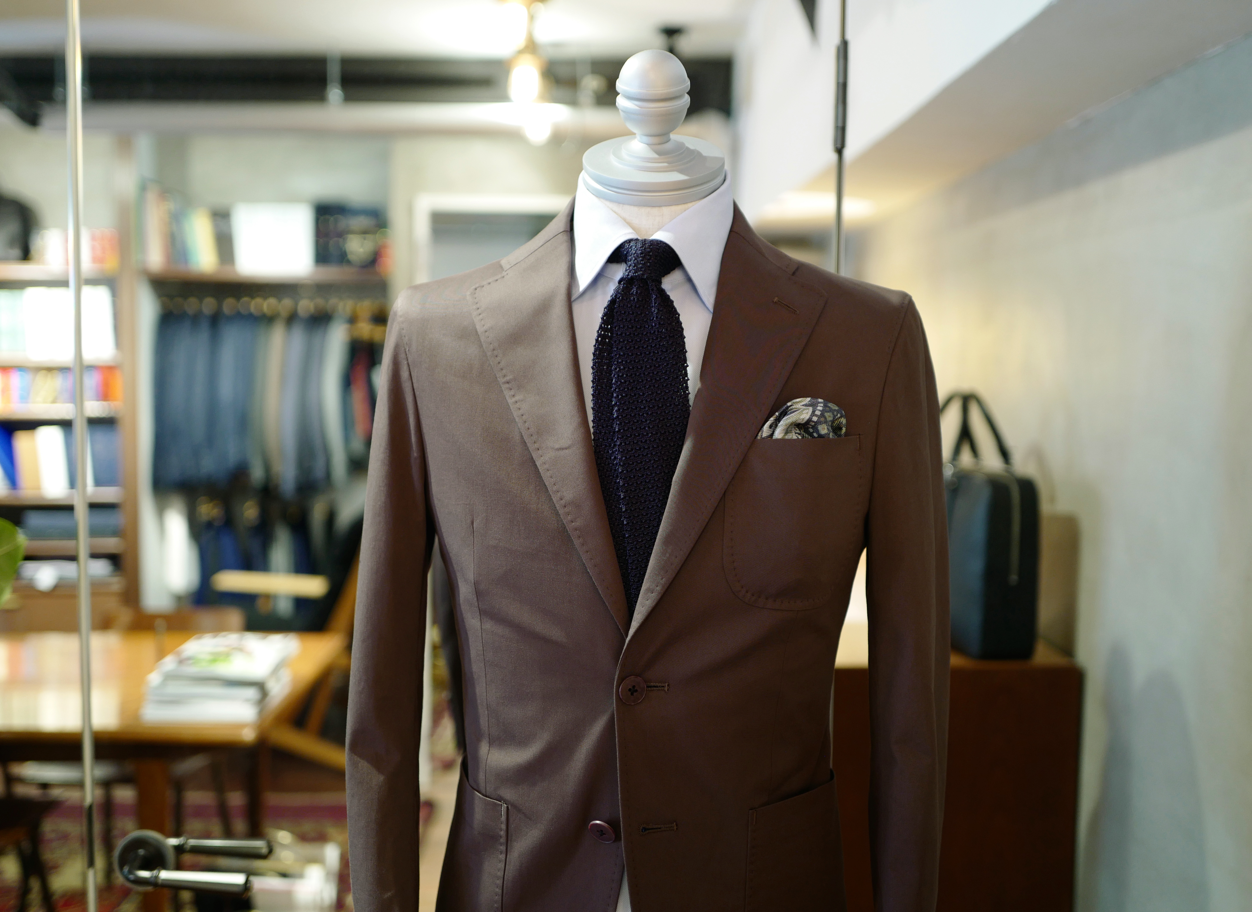 ちなみのコチラのジャケット、写真からは伝わりづらいのですが、ラペルの角が丸みをおびている”クローバー衿”というデザイン。柔らかな印象になりますので、休日の羽織るジャケットをこのような仕様にしてみるのも良いと思います。ちょっとした気分転換になるかも。