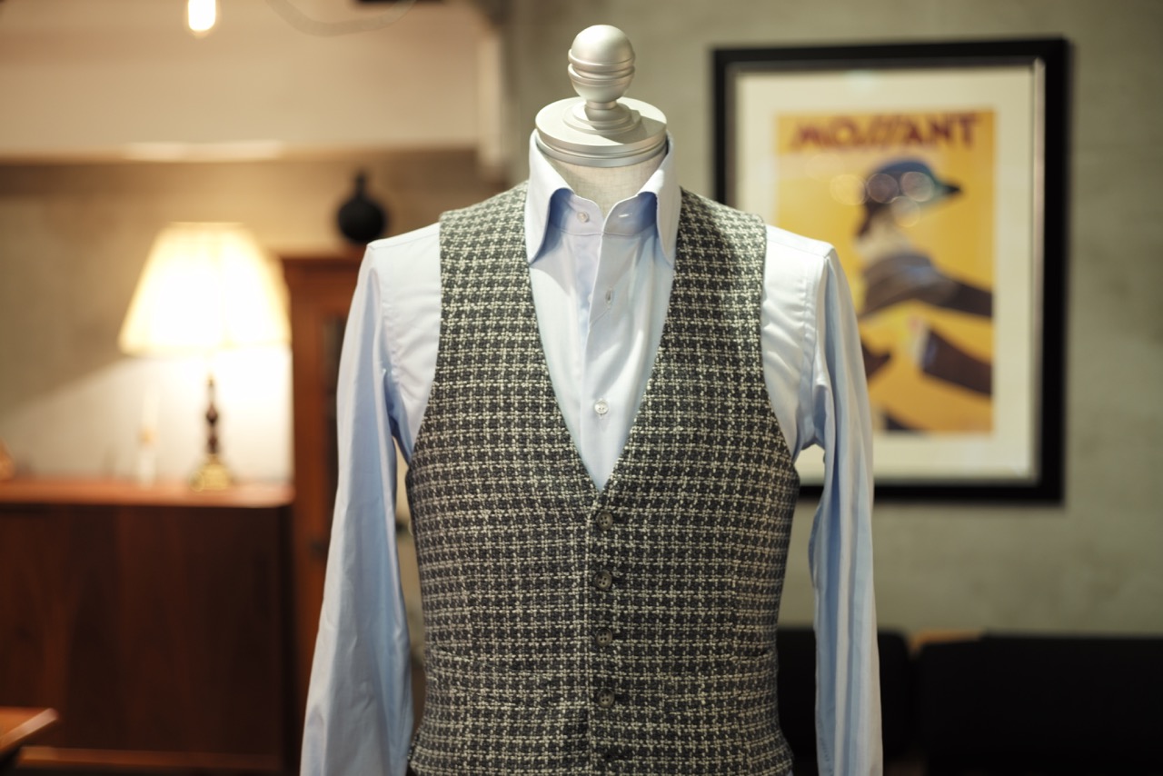 本日は、世界を股にかけご活躍するN様にお創りいただきました”オーダージレ”を紹介させていただきます。世界基準で考えるジレはこのような仕上がりです。