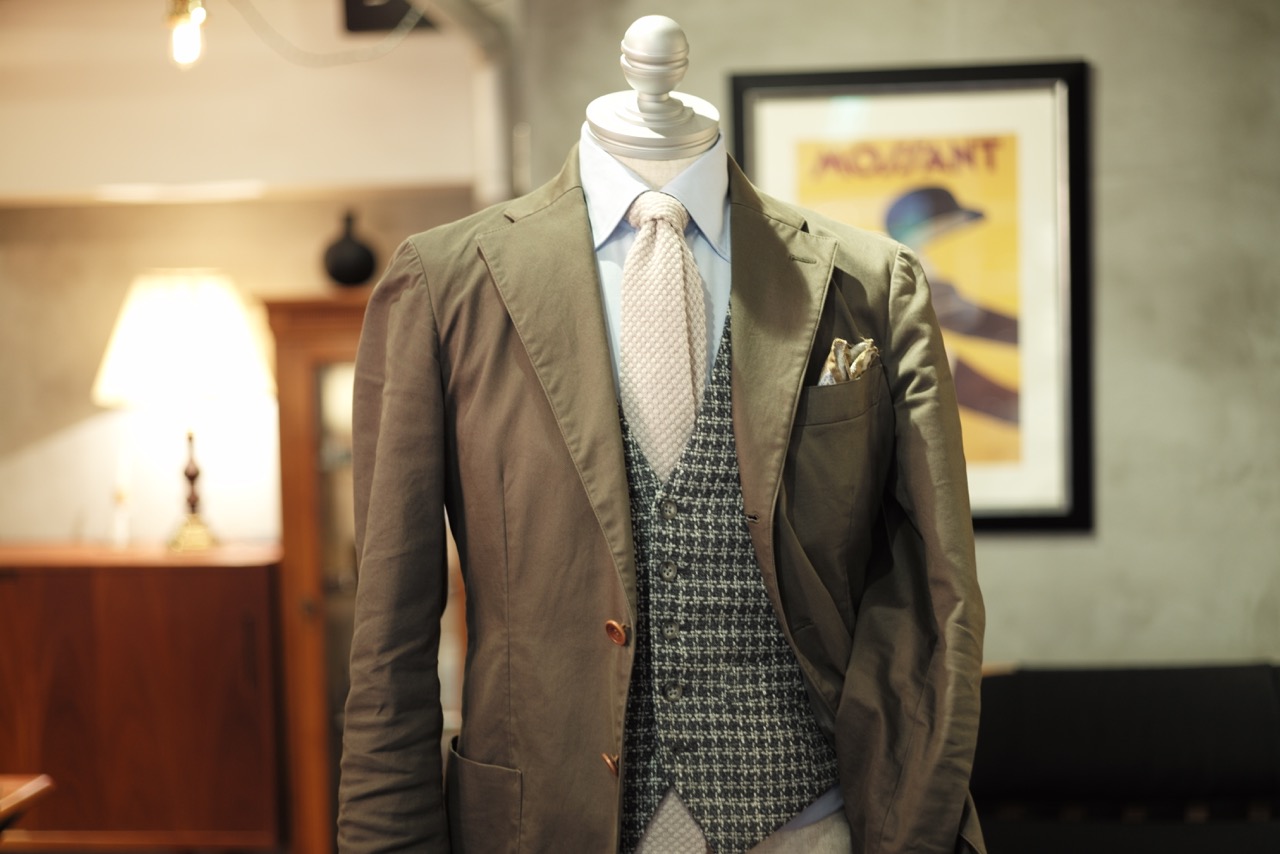 お馴染みのイタリアはカノニコの生地で、派手すぎず、地味すぎず、とても良いさじ加減のジレが完成しました。どんな洋服にもマッチするうえに、絶妙に旬な空気を吹き込める印象。このジレをインナーに挟むだけで全く新鮮な装いが楽しめそうです。