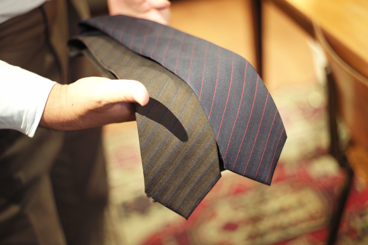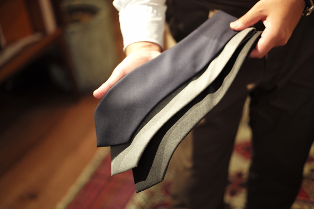 そんなステファノ・ビジのタイですが、今回はウール素材のもの。ウールと言っても皆様が想像する起毛感のあるものではなくて、スーツ生地のように艶やかで滑らかな素材感。ここがポイントで非常に品のある印象、さらには高級感が生まれます。シルクとは一味違う美しいドレープ。一度はスーツに合わせたいと思わせてくれる逸品です。ぜひ店頭にて、ステファノビジのタイを手に取ってみてください。